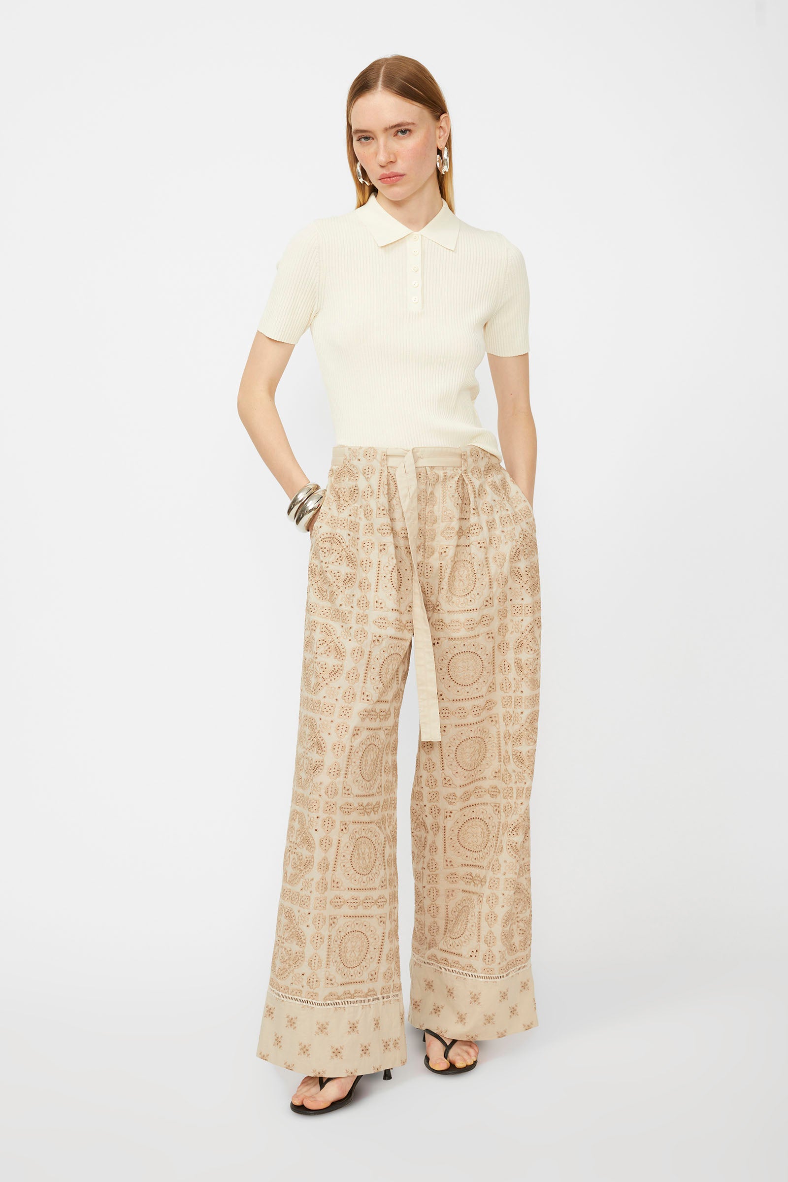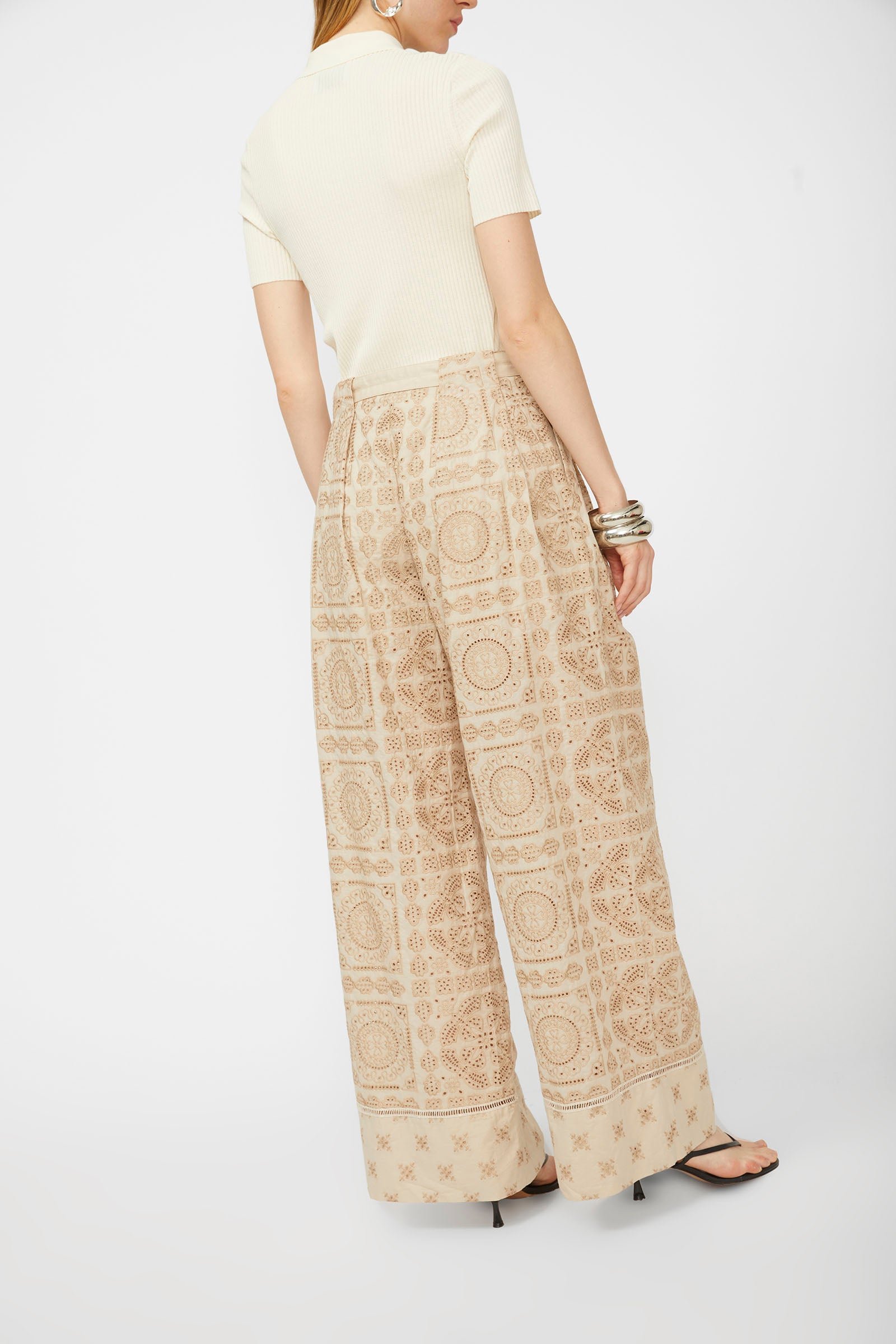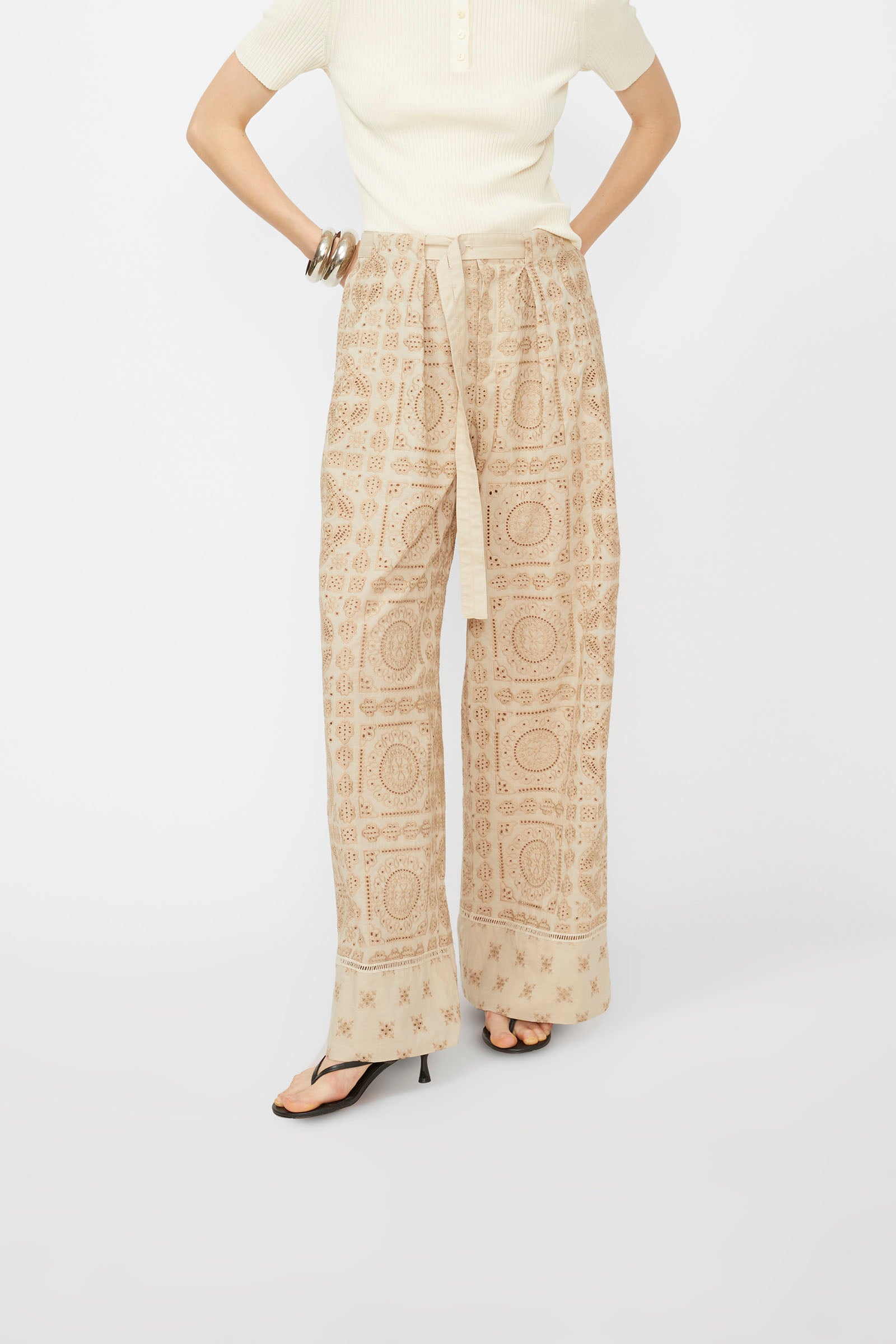 PANTALONI LUNGHI CON PIEGHE E TOPPA IN BRODERIE ANGLAISE.