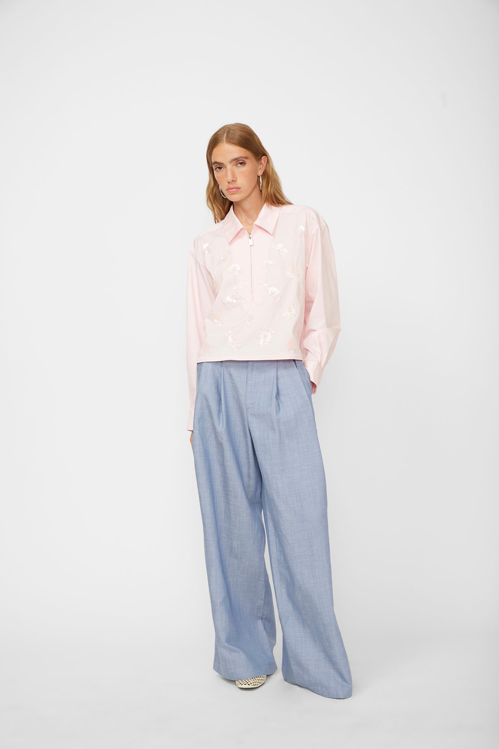 CAMICIA CORTA CON ZIP E RICAMO DI PAILLETTES A FORMA DI FIORE.